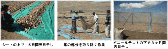まず15日間シートの上で天日干しされ、夜露に濡れないように夜はシートが被せられます。この間に良質なマカだけをセレクトします。セレクトされたマカは葉の部分を取り除き15日間シートで天日干しされた後、ビニールテントの下で3ヶ月間天日干しされます。