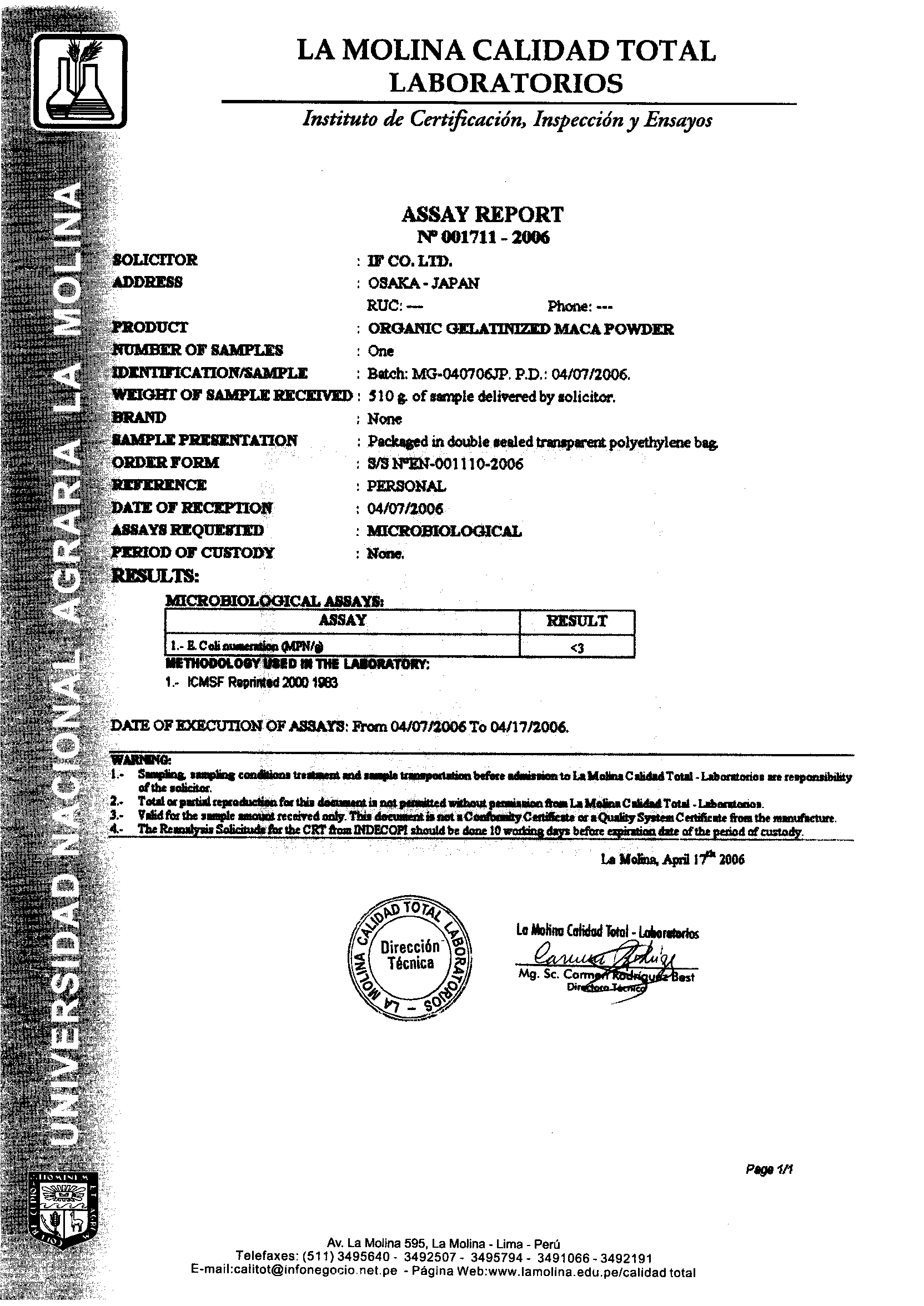 マカの栽培地は全てSKALによって有機栽培の証明がされていますが、日本でも農薬や殺菌剤などに含まれる二酸化硫黄の検査を行なっています。衛生面では、成分が壊れない温度でじっくりと一時間乾燥(熱処理)させて殺菌を行っています。また、水分を無くすことによって雑菌が繁殖しないようにしています。ラ・モリーナ・ペルー国立農業大学で病原菌などの微生物検査が行われ、有機JAS認定商品の条件である日本の有機農産物加工食品製造認定工場でマカを錠剤加工しています。マカの充填(袋詰め)についても当該工場の衛生的な施設で行っています。